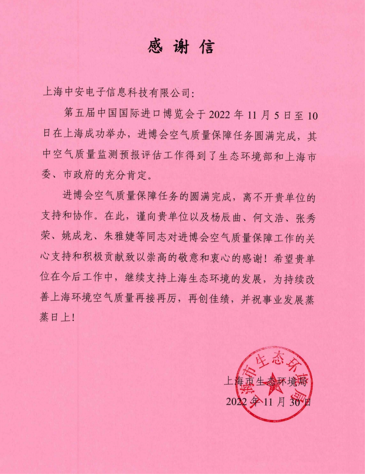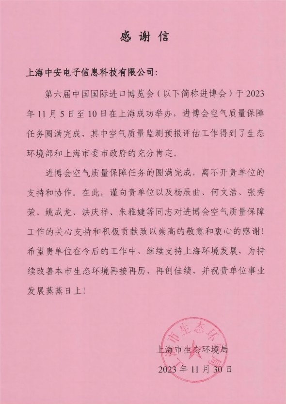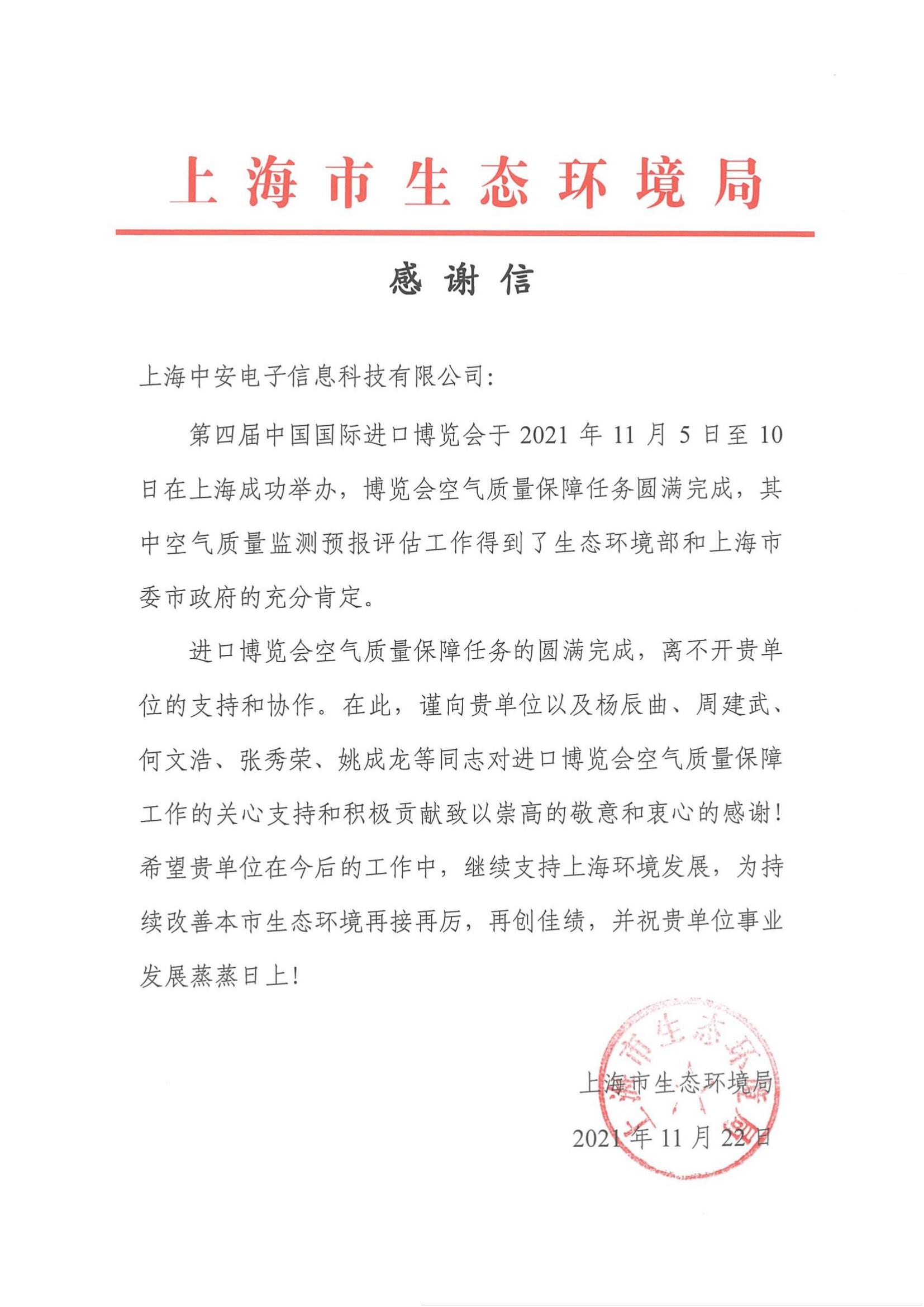 上海環(huán)監(jiān)中心就中安科技在21年國(guó)際進(jìn)博會(huì)空氣質(zhì)量監(jiān)測(cè)預(yù)報(bào)工作中杰出貢獻(xiàn)送來感謝信!(2021/12/31)